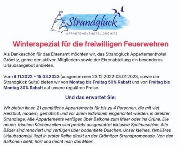 Neuer Bonuspartner vom Landesfeuerwehrverband Schleswig-Holstein ist das Strandglück Appartementhotel Grömitz geworden.